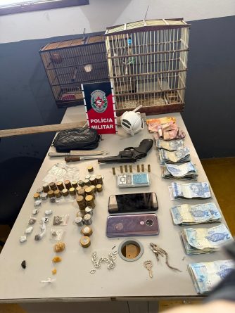 Durante rondas, a equipe policial identificou uma motocicleta com sinais de adulteração e, ao tentar realizar a abordagem, o suspeito empreendeu fuga, sendo contido em seguida. Na residência ligada à ocorrência, foram localizados entorpecentes, uma arma de fogo com munições e aves silvestres sem autorização legal (foto abaixo).