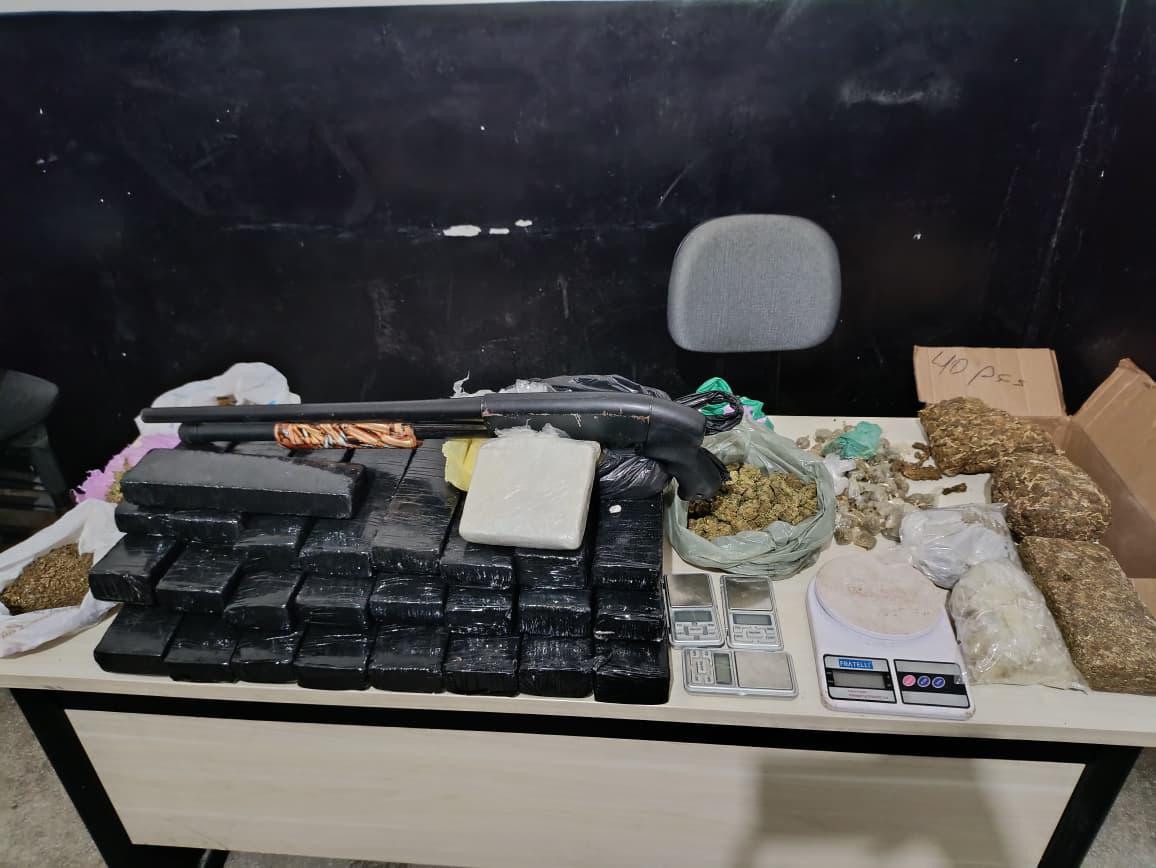 A apreensão foi resultado de denúncias recebidas pela PM. O imóvel que estava sendo usado como depósito não tinha característica de moradia, apenas de que era específico para armazenar os entorpecentes. Além da arma, que era de calibre 12, foram apreendidas drogas dos tipos maconha (12, 35 kg), skank (1,3 kg) e cocaína (1,3 kg).