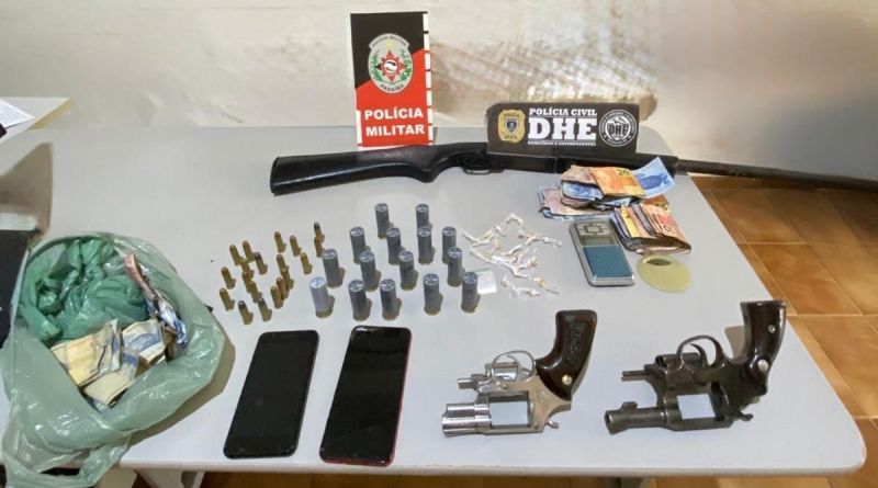 As equipes policiais realizaram uma operação e prenderam os dois suspeitos em uma residência no bairro Liberdade. A ação resultou na apreensão de 01 espingarda, calibre 12, 02 revólveres, calibre 38, munições, 21 pedras de crack, 01 papelote de cocaína, 01 balança de precisão, celulares e dinheiro, em espécie.