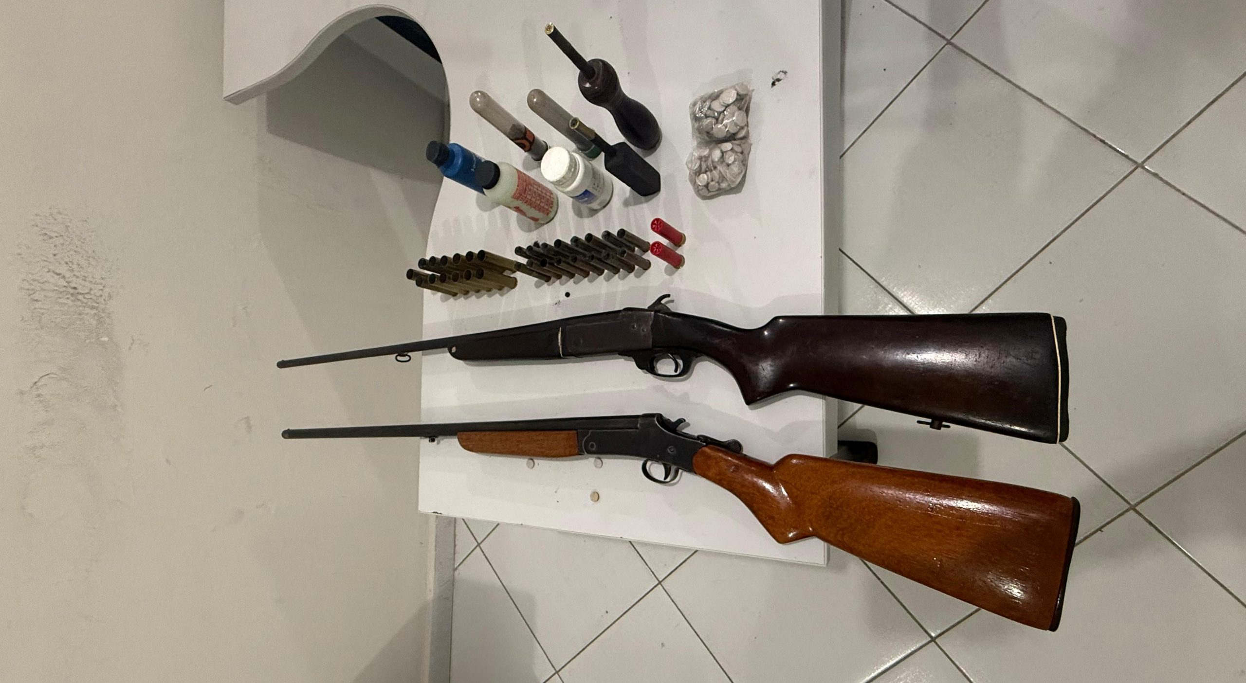 Ele tentou se desfazer de alguns objetos assim que percebeu a presença da PM. O suspeito estava com material para recarga de munições. Nas buscas, as armas foram localizadas. A ocorrência foi levada para a Delegacia de Polícia.