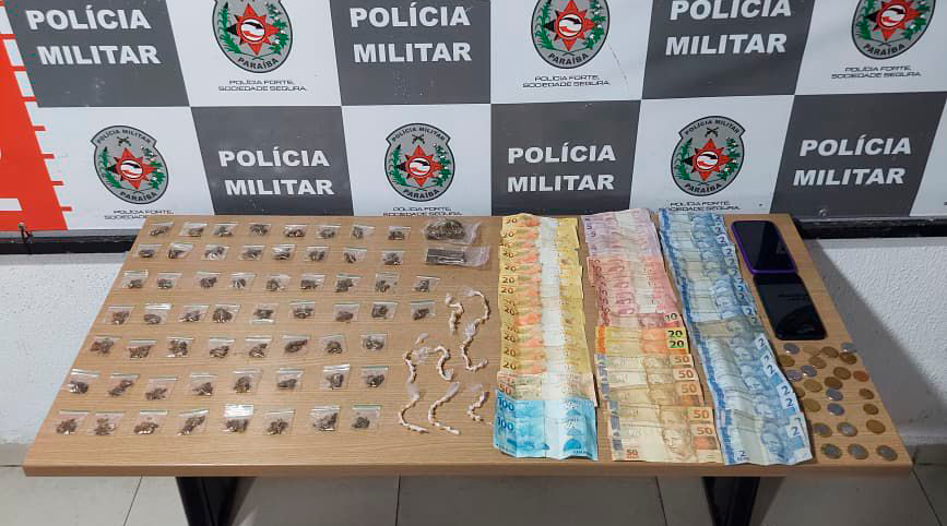 Com o suspeito detido foi possível localizar e apreender uma quantidade significativa de entorpecentes e outros materiais ligados ao crime, como: 60 sacolés de maconha, 67 pedras de crack, R$ 1.010,60 reais, em espécie e celulares.