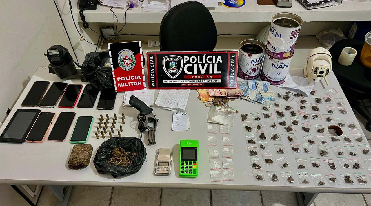 Na ação foi apreendido um revólver, calibre .38, com 19 munições, além de drogas, como cocaína e maconha, com porções fracionadas e embalagens para comercialização. Também foram encontrados materiais típicos do tráfico de drogas, como balança de precisão, anotações, câmeras de monitoramento, maquinetas, celulares e dinheiro.