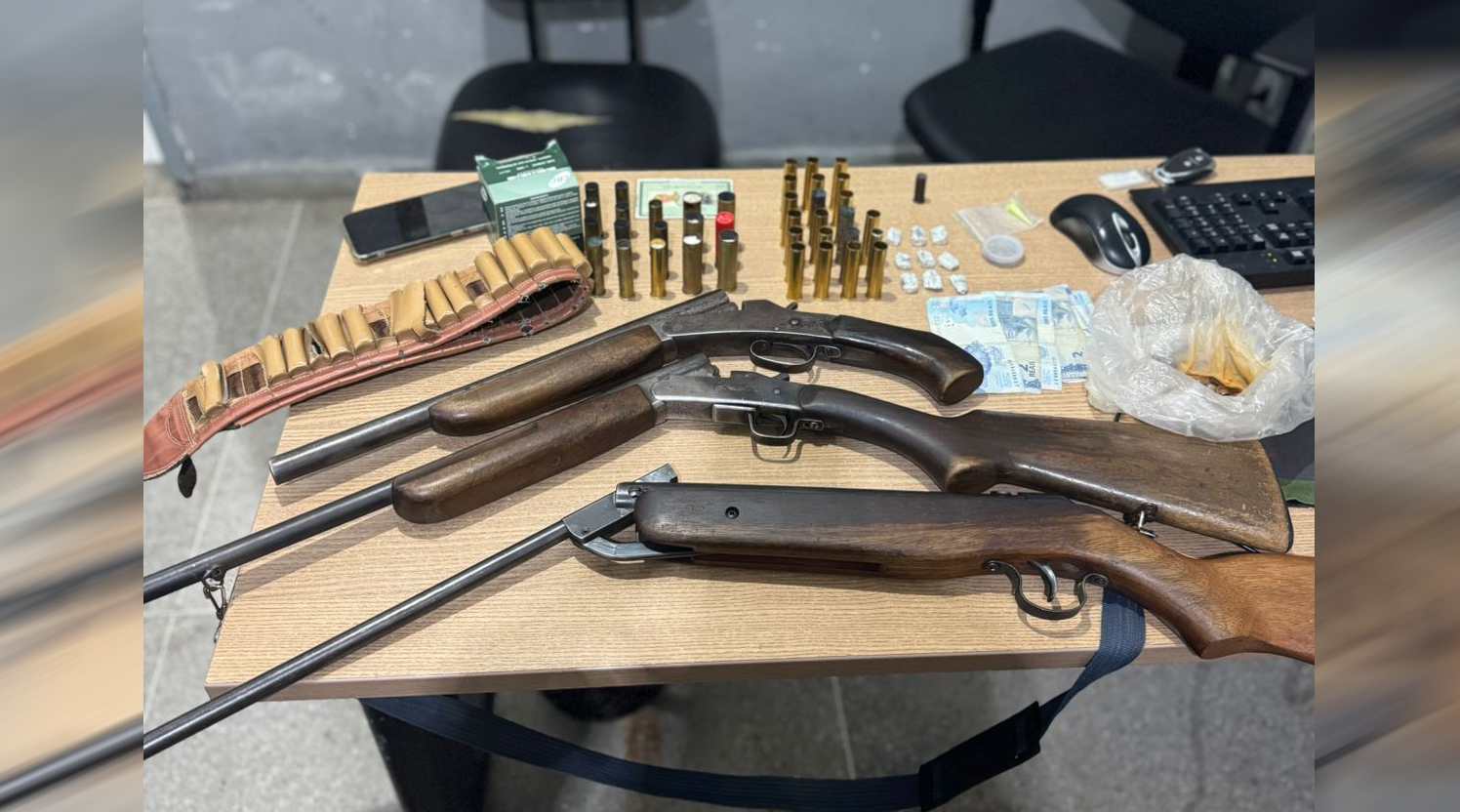 A vítima informou que seu companheiro havia ameaçado e que ele se encontrava na residência. Diante da denúncia, os policiais se deslocaram imediatamente ao local e, ao chegarem, os militares identificaram o suspeito, que tentou fugir, mas foi alcançado e detido. Na abordagem, foram apreendidas três armas de fogo, munições e substâncias análogas a entorpecentes.