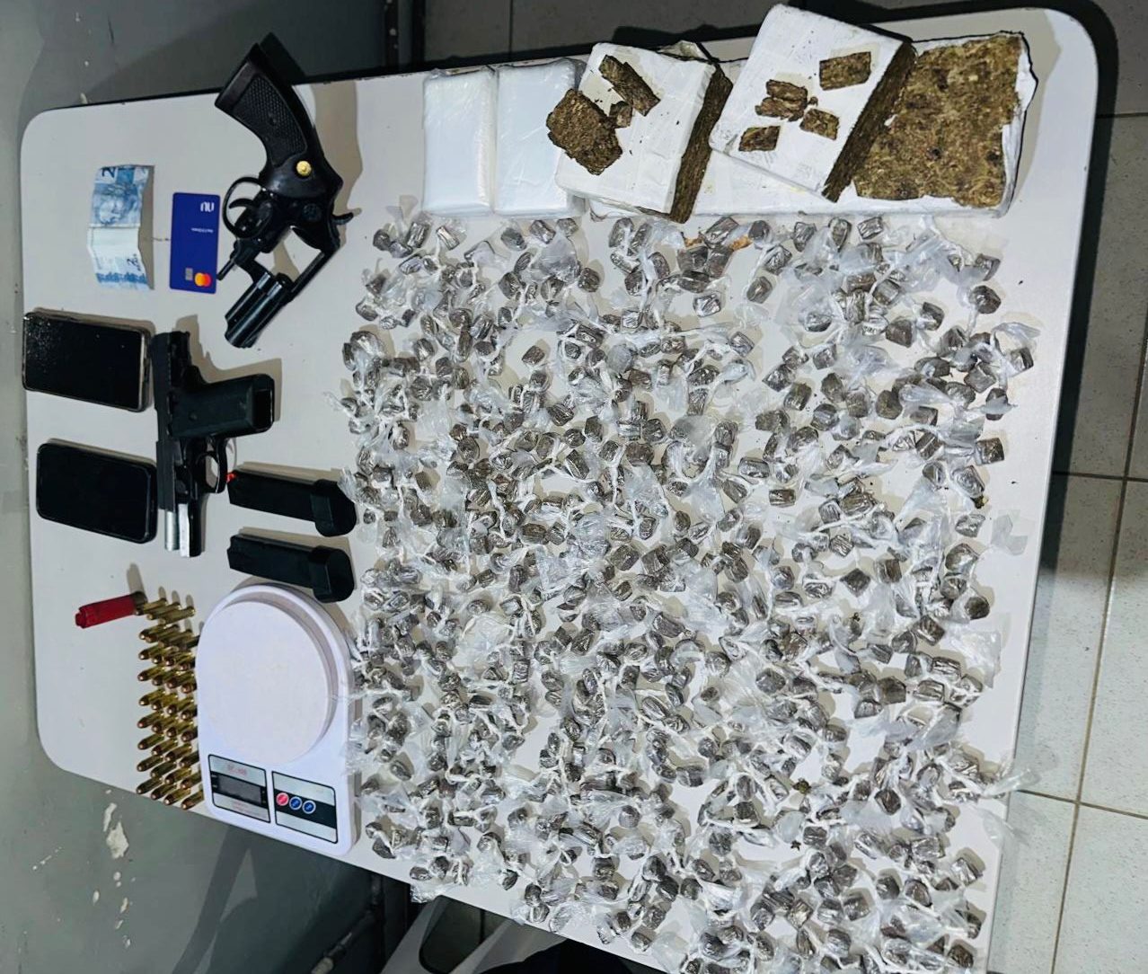 Dois revólveres, mais de 30 munições e várias embalagens com maconha. Esse foi o material apreendido pelos policiais militares do 11º Batalhão, nesta sexta-feira (2), com dois acusados de terem envolvimento em um homicídio que ocorreu recentemente, na cidade de Serra Branca.
