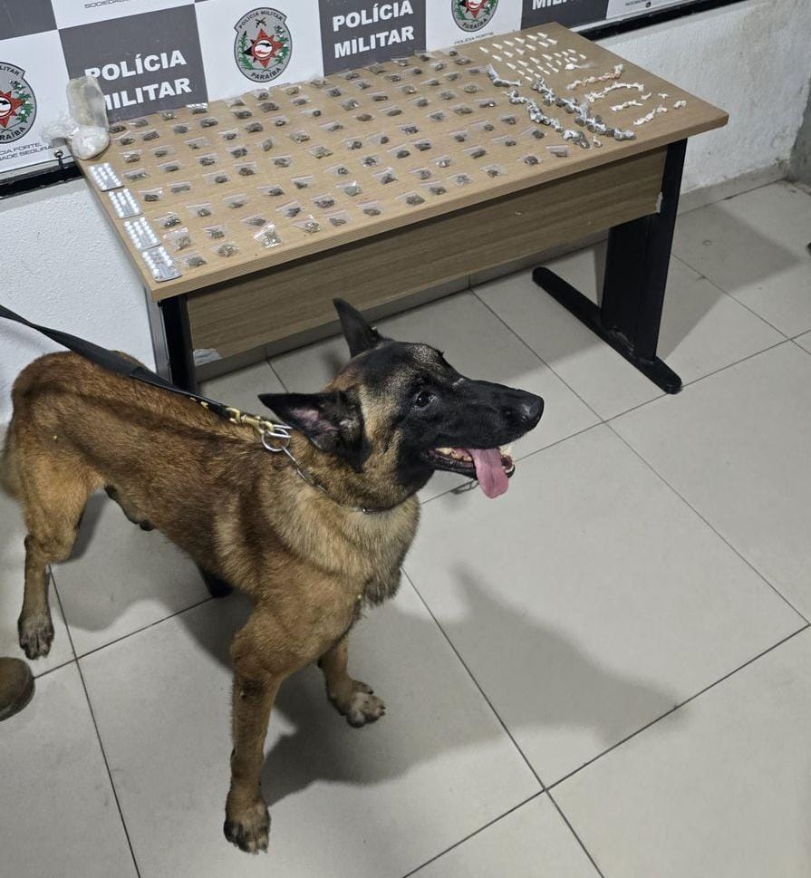 Foi com a ajuda do faro do cão Giraya (fotos acima e abaixo), que a Polícia Militar apreendeu cerca de 300 porções de drogas e desarticulou mais um ponto de tráfico em João Pessoa. A ação aconteceu nesta última sexta-feira (30), no conjunto Nova República.