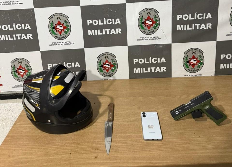 A Polícia Militar frustrou um casal que tentou roubar uma motocicleta, na noite desta sexta-feira (30) no Centro de João Pessoa. A dupla foi presa em flagrante, estava com um simulacro de arma de fogo, faca (foto acima), e um dos acusados já tinha um mandado de prisão em aberto.