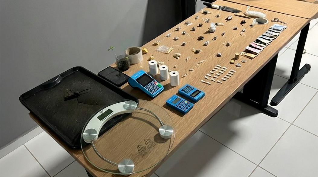 Foi realizado cerco no local e o indivíduo foi interceptado e abordado. Com os suspeitos, um adolescente e um homem, foram encontradadas drogas e materiais utilizados para a preparação e fracionamento dos entorpecentes, os quais foram apreendidos.