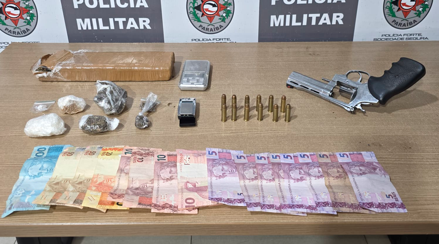 As equipes policiais receberam informações que um indivíduo estaria ameaçando outras pessoas com uma arma de fogo no condomínio São Rafael, no bairro Gramame. Ao chegar no endereço indicado foi mantido contato com a esposa do suspeito, que teria fugido ao perceber a chegada dos policiais. Na residência foram encontrados um revólver, calibre 38, com munições intactas, cocaína, crack, maconha, balanças de precisão e dinheiro, caracterizando que o local era utilizado para o tráfico de drogas.