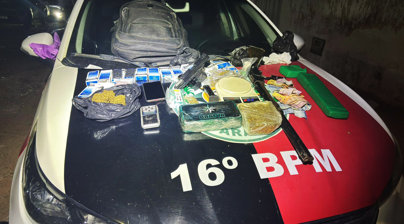 Com ele e no interior da residência foram apreendidos uma pistola, calibre .380, um rifle calibre .38, munições, grande quantidade de entorpecentes, balanças de precisão, aparelhos celulares, dinheiro, maquineta para cartões e materiais utilizados para o acondicionamento da droga.