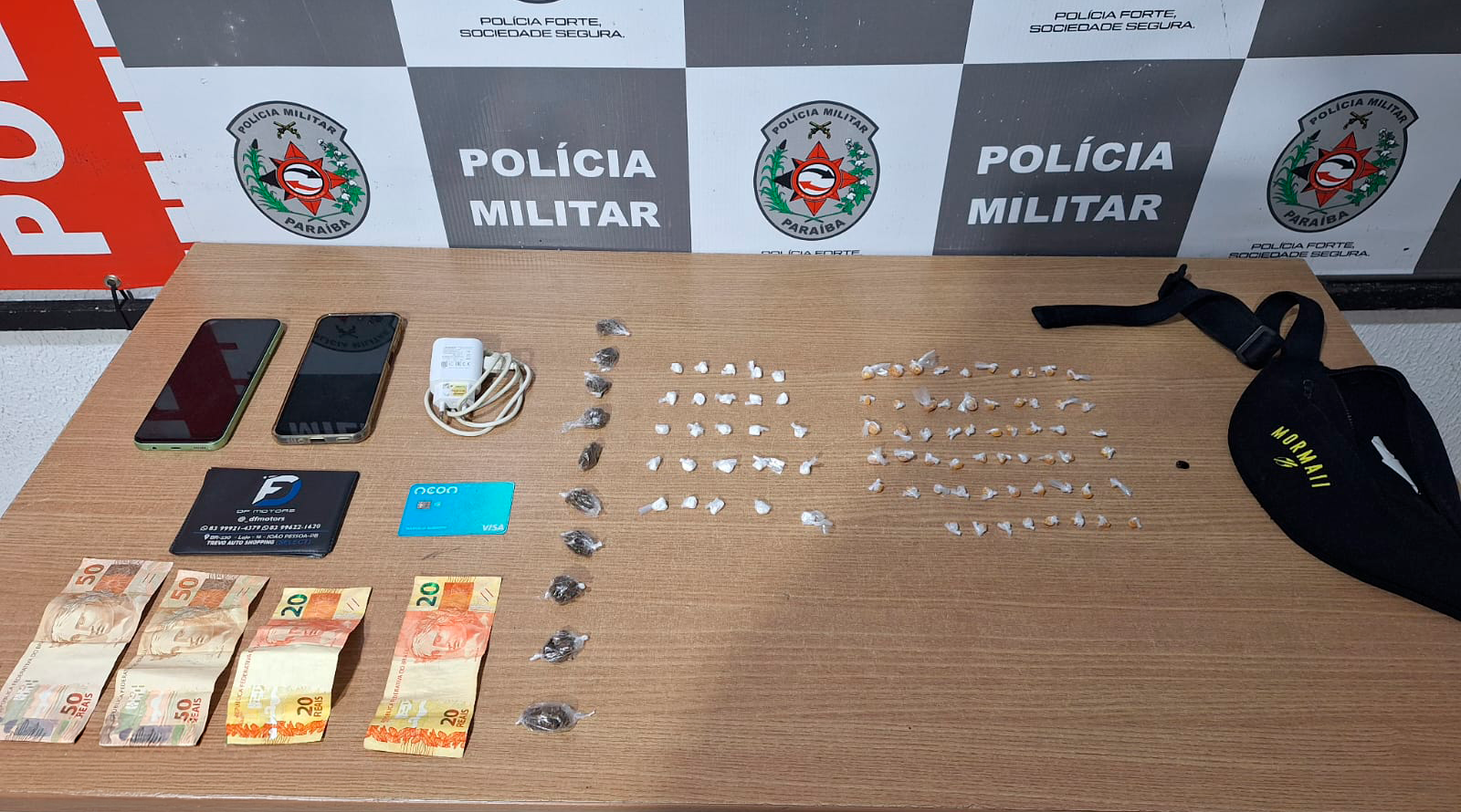 Ao todo, foram apreendidos 10 porções de maconha, 25 porções de cocaína e 48 porções de crack, haxixe, além de dois aparelhos celulares, cartão de crédito e a quantia de R$ 140,00 reais.
